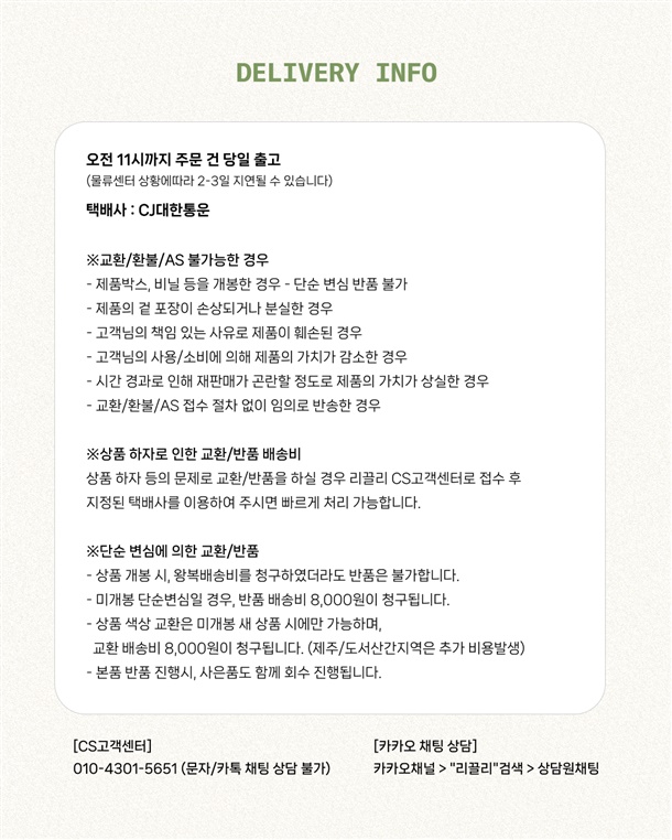 · 배송은 입금확인된 날짜로부터 1~3일 소요되며 최대 7일 이내 출고됩니다. (공휴일, 기상악화 등 불가피한 상황에 따라 추가 지연될 수 있습니다.)