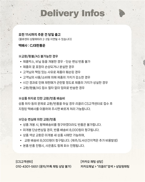 · 교환/반품 신청은 배송완료 후 7일 이내에 가능합니다.