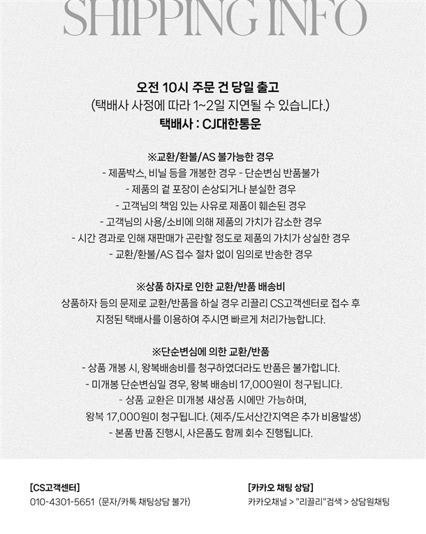 · 일부 상품에 대해서 교환/반품 정책이 위와 상이할 수 있습니다.