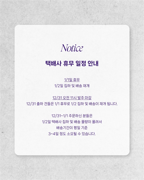 · 배송은 입금확인된 날짜로부터 1~3일 소요되며 최대 7일 이내 출고됩니다. (공휴일, 기상악화 등 불가피한 상황에 따라 추가 지연될 수 있습니다.)