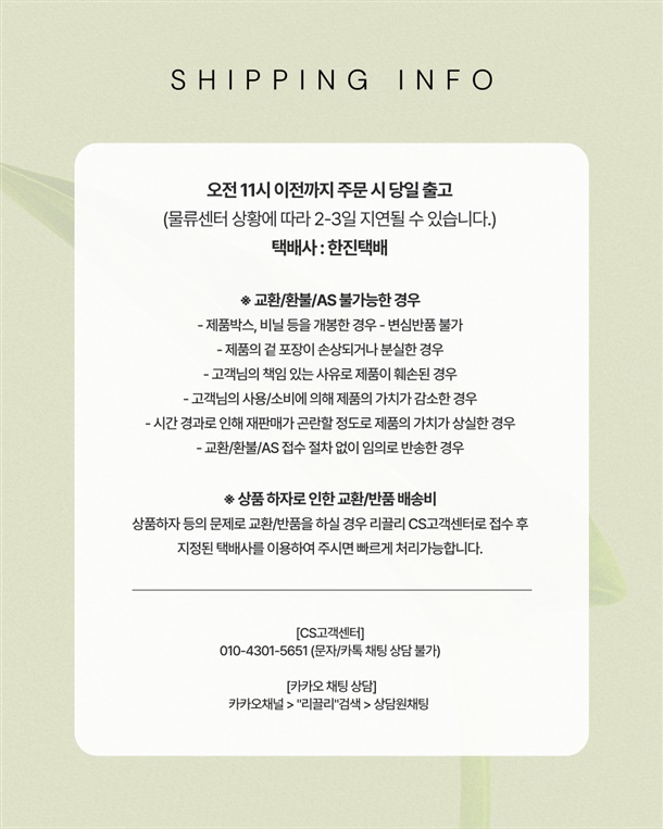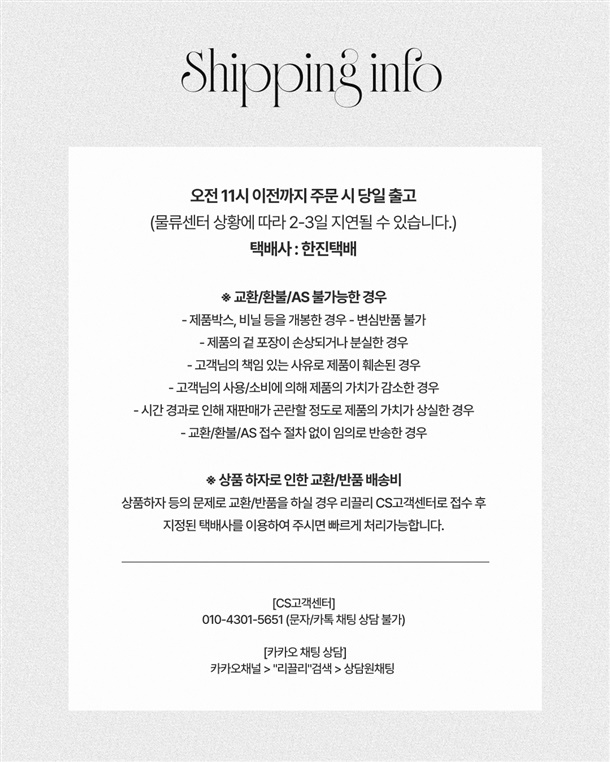 · 배송은 입금확인된 날짜로부터 1~3일 소요되며 최대 7일 이내 출고됩니다. (공휴일, 기상악화 등 불가피한 상황에 따라 추가 지연될 수 있습니다.)