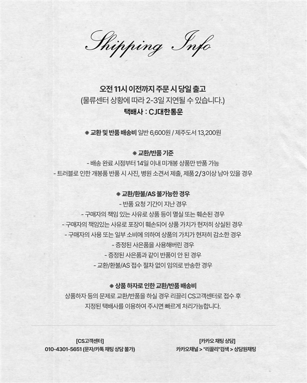 · 배송은 입금확인된 날짜로부터 1~3일 소요되며 최대 7일 이내 출고됩니다. (공휴일, 기상악화 등 불가피한 상황에 따라 추가 지연될 수 있습니다.)