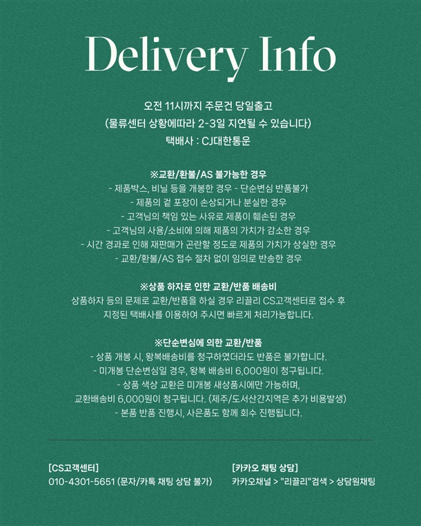 · 배송은 입금확인된 날짜로부터 1~3일 소요되며 최대 7일 이내 출고됩니다. (공휴일, 기상악화 등 불가피한 상황에 따라 추가 지연될 수 있습니다.)