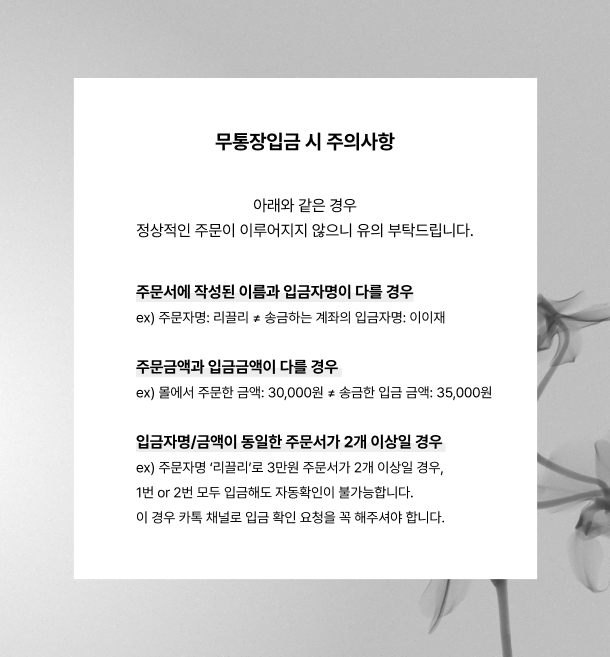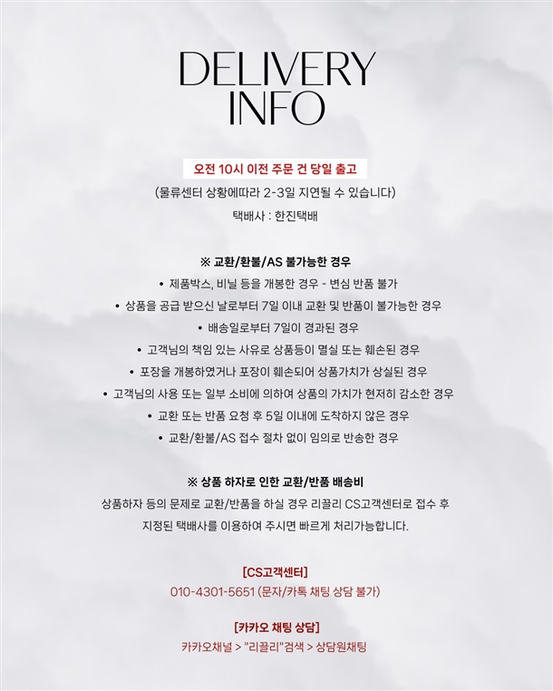 · 배송은 입금확인된 날짜로부터 1~3일 소요되며 최대 7일 이내 출고됩니다. (공휴일, 기상악화 등 불가피한 상황에 따라 추가 지연될 수 있습니다.)