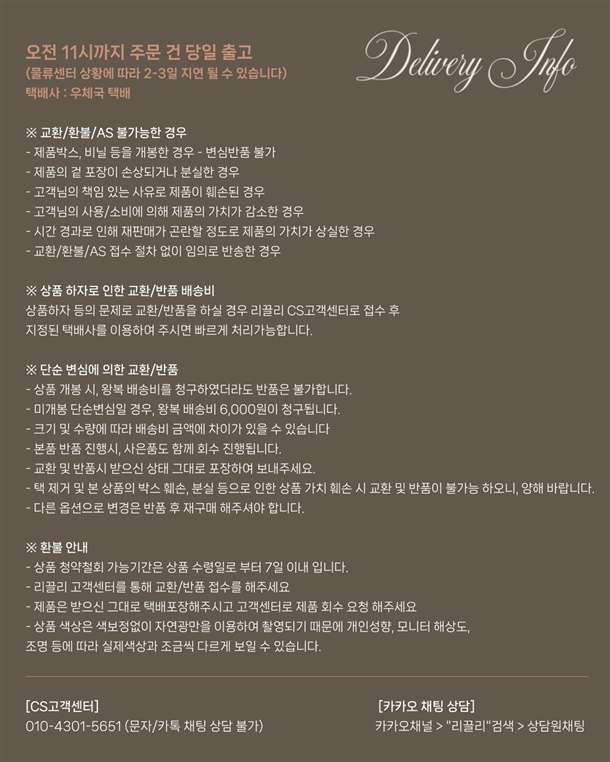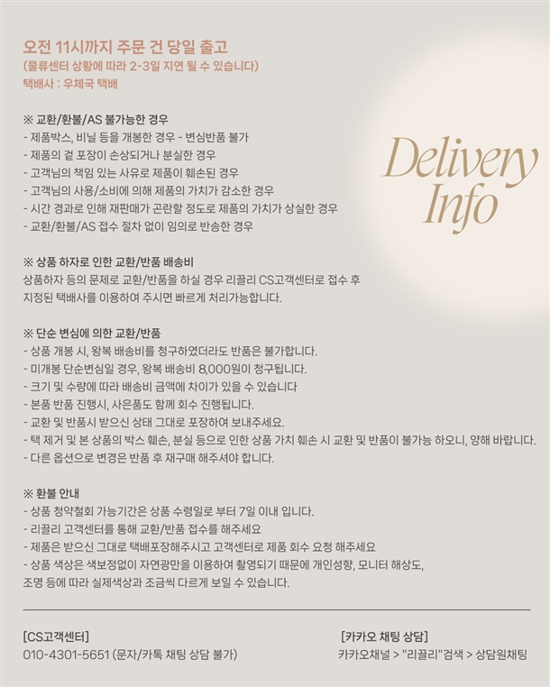 · 변심 교환/반품의 경우 왕복 택배비를 부담해 주셔야 합니다. (택배비 상품별 상이)